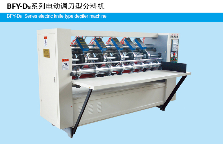The machine adopts the front creaser for guiding carton board and double-rubber roller for leading carton board. Cutter blade distance is adjusted electricly.Pneumatic locked, high-quality tungsten steel alloyed cutter blade.the blade can be sharpened both automaticly and manually when the machine is working.
